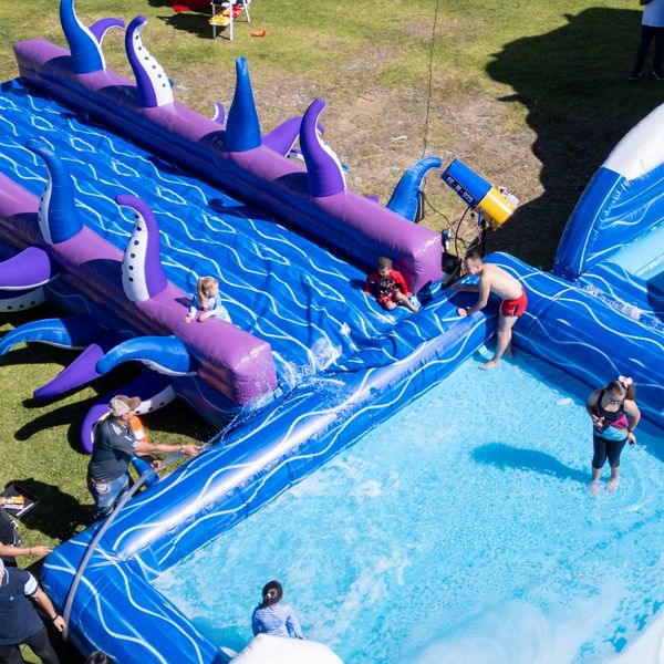 Un mega tobogán acuático con temática marina y un pulpo gigante en la parte superior que se roba todas las miradas. Ideal para eventos grandes, fincas, colegios y actividades recreativas donde buscan impacto visual y diversión extrema.